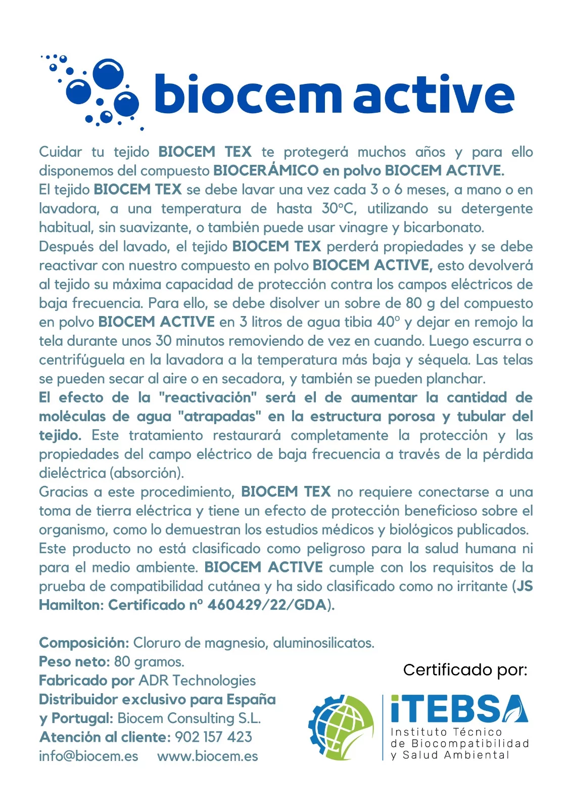 Este producto no está clasificado como peligroso para la salud humana ni para el medio ambiente. BIOCEM ACTIVE cumple con los requisitos de la prueba de compatibilidad cutánea y ha sido clasificado como no irritante (JS Hamilton: Certificado no 460429/22/GDA).